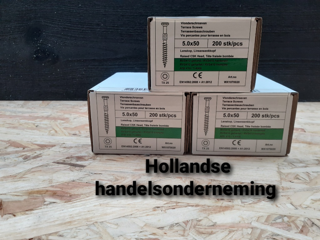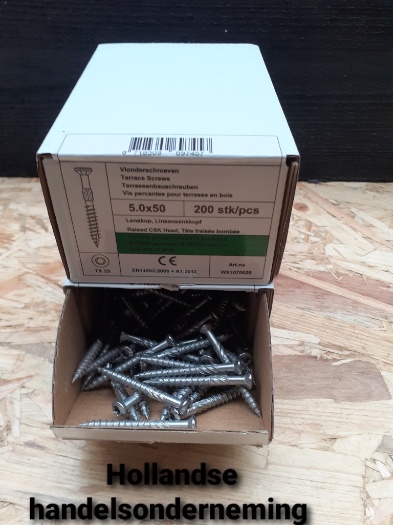De perfecte schroef voor uw vlonder door zijn kleine verzonken kop en de torx vorm verbeterd de grip van uw bit waardoor deze geen kans heeft om af te breken. Deze worden verkocht per doos van 200 stuks.